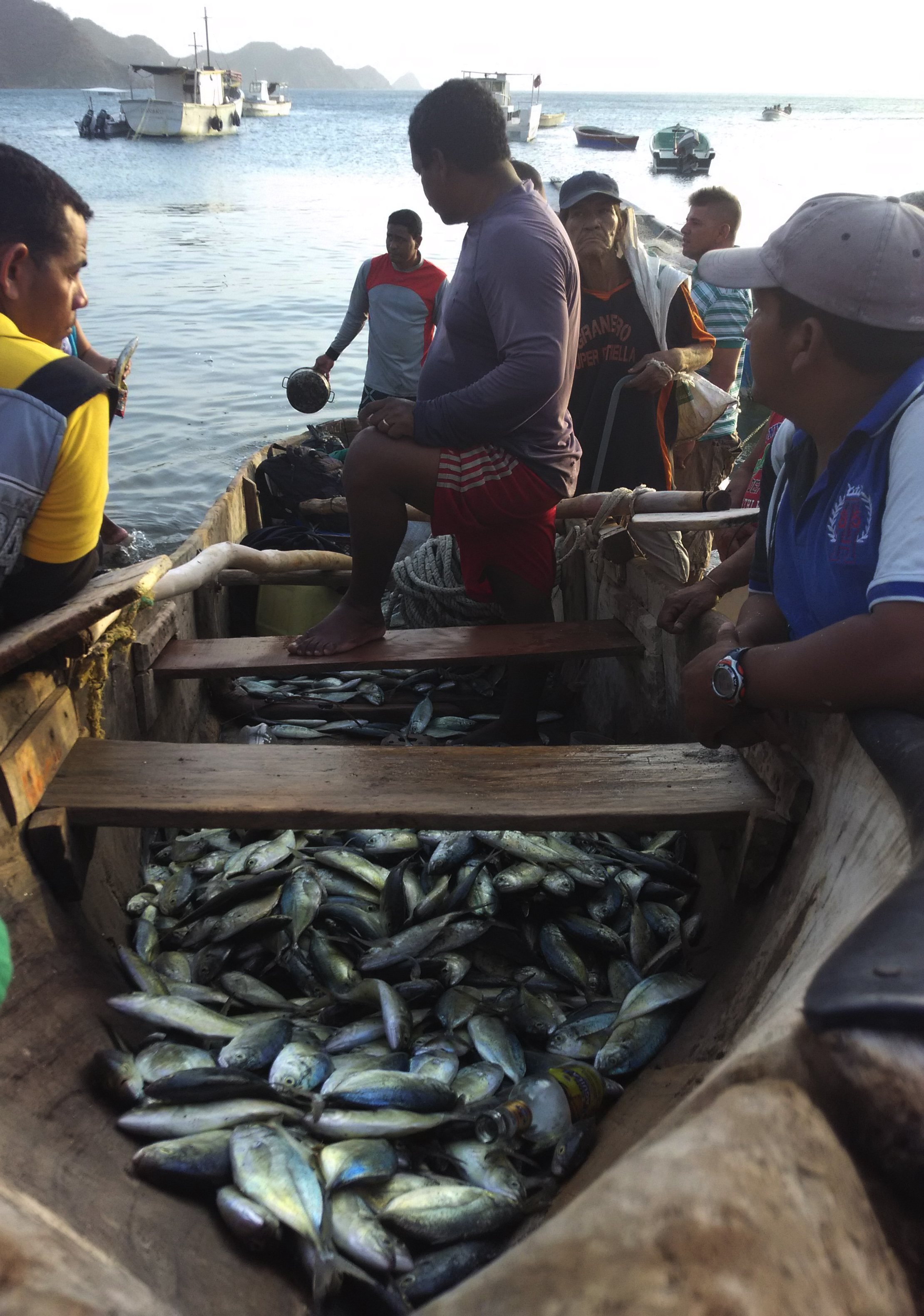 After waiting and waiting again the diver shouts again, and finally they got a great number of fish, a whole shoal of “cojinovas”. Time to leave today, it is 5:30 pm and the sun will set soon but there is still a final stop for them to be part of, back in the main beach in Taganga all of the fishermen groups come together to weigh the different catches, then is time to get a proportional amount of fish for each of the participant fishermen, the rest will go for either direct sale there, where the community is waiting for getting the best pieces for cheaper and the markets around. Still in Taganga fishing is the sole means of making money of many families and it was nice to see that the men fishing were a mixture of generations. They are just an organised number of groups fishing and still the familiar and community sense is still there.